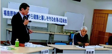 開会挨拶で紺野会長は、浪江町からいわきに避難していた女子高校生が最近亡くなり葬儀に駆けつけたこと、2歳の時に事故に遭ったその子が避難先でいじめにあったことを話し「改めて原発事故の悲惨さを感じさせられた。二度とこのようなことが起こらないようにしなければ。」と訴えました。